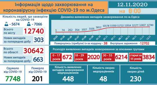 За інформацією Одеського обласного лабораторного центру МОЗ України, на ранок 12 листопада 2020 року в Одеській області зареєстровано 30 642 випадки Covid-19. З них 12 740 осіб – жителі Одеси.