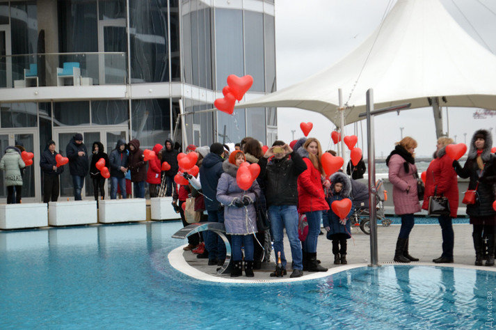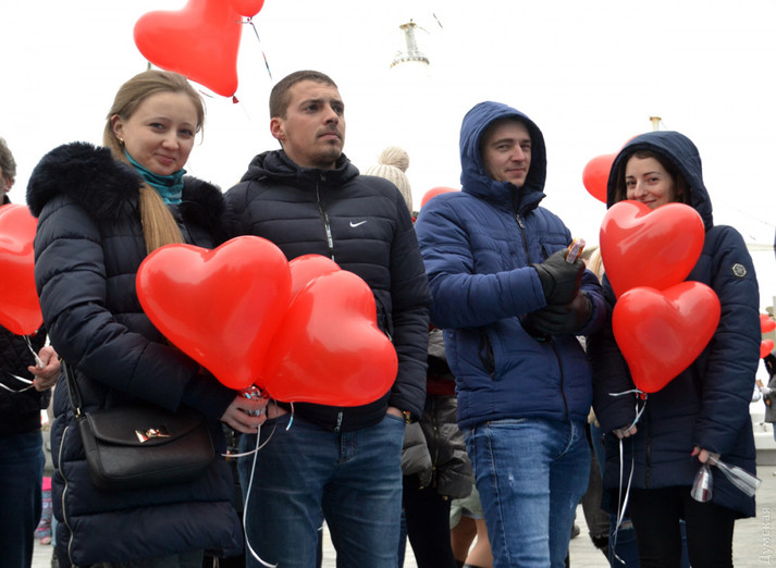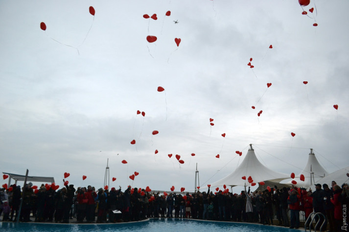 Після відкриття пляшок закохані запустили в небо надувні кульки у вигляді сердець.