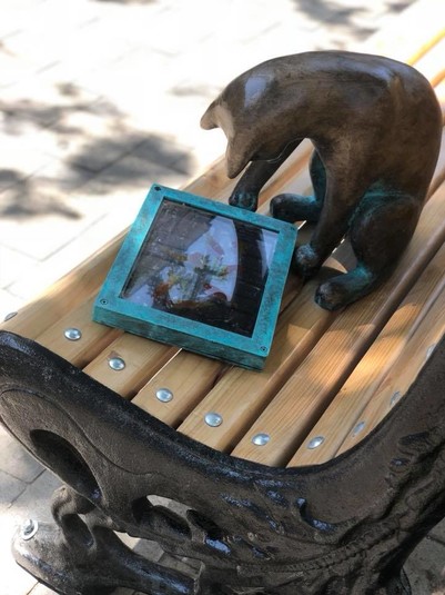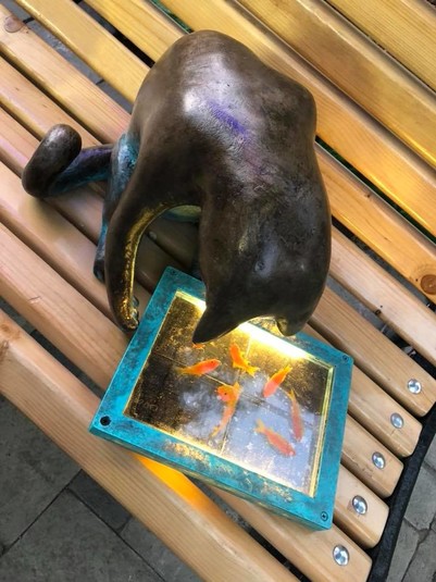 Нову скульптуру встановили не просто на лавці, а на «Скаймейці», яка теж є одним із проектів платформи «Добра справа». Перед Пушинкою лежить планшет, на якому кішка спостерігає за золотими рибками. За словами Кавуна, цей гаджет працює на сонячних батареях та світиться.