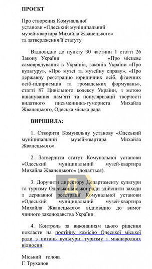 «Установа створена з метою вивчення, збереження, використання та популяризації пам’яток та інформації, пов’язаної з життям і творчістю видатного письменника і сатирика Михайла Жванецького, а також для залучення громадян до надбань національної літератури», – йдеться в проекті документа.