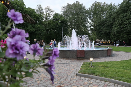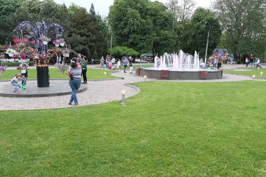 Також по обидва боки фонтана розташувалися ковані дерева, прикрашені підвісними чашами з різнокольоровими петуніями. При впорядкуванні території було оновлено 660 кв. м газону на центральній клумбі, проведено формування крон дерев і кущів.