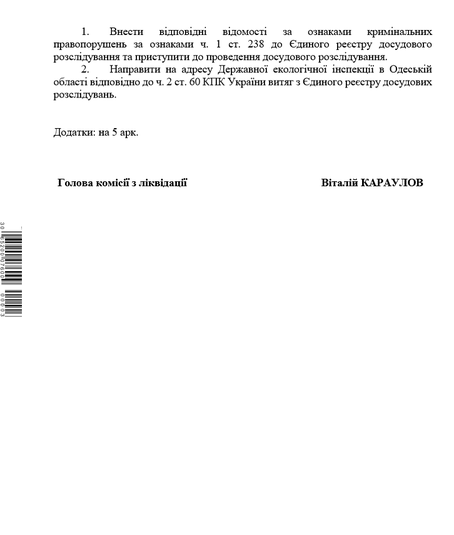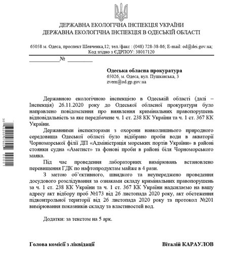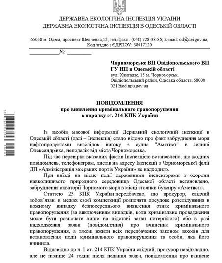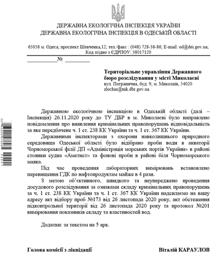 За фактом неповідомлення АМПУ про випадок забруднення ДЕІ звернулась до Нацполіції, ДБР та Одеської обласної прокуратури стосовно відкриття кримінального провадження.