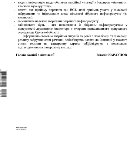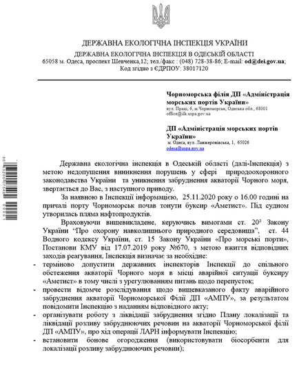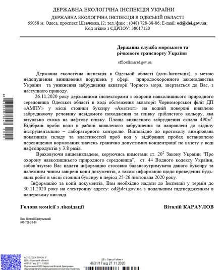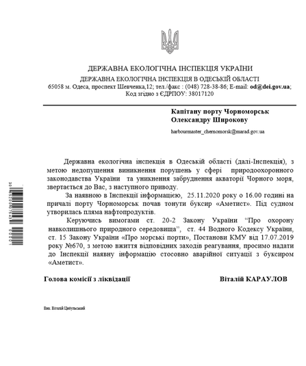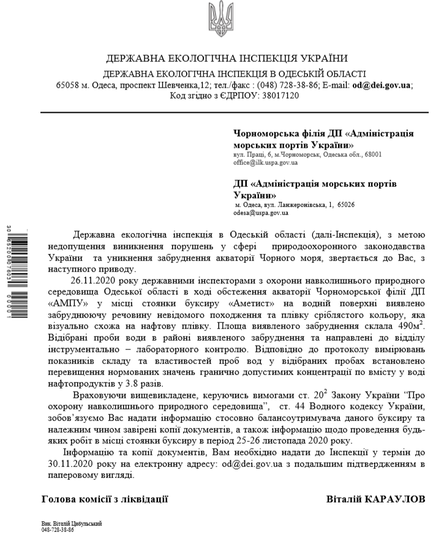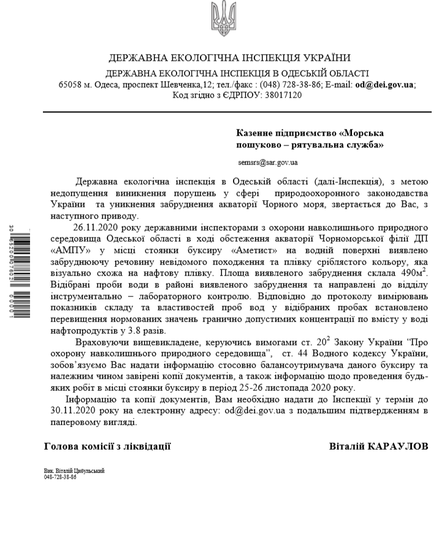 «26 листопада вночі із засобів масової інформації стало відомо, що це судно почало тонути і з нього стався витік нафтопродуктів. В телефонному режимі керівництво ДЕІ Одеської області зв’язалося з Адміністрацією морських портів України (АМПУ) і там заперечили цей факт. На ранок ми офіційно звернулись до ДП «АМПУ» та його Чорноморської Філії з проханням терміново допустити державних інспекторів до спільного обстеження акваторії Чорного моря в місці аварії буксиру. Однак, на підприємстві лист ДЕІ проігнорували. А капітан Чорноморського морського порту, до якого Держекоінспекція також надсилала запит, відповів про відсутніть зазначених порушень», - пояснив Андрій Мальований.