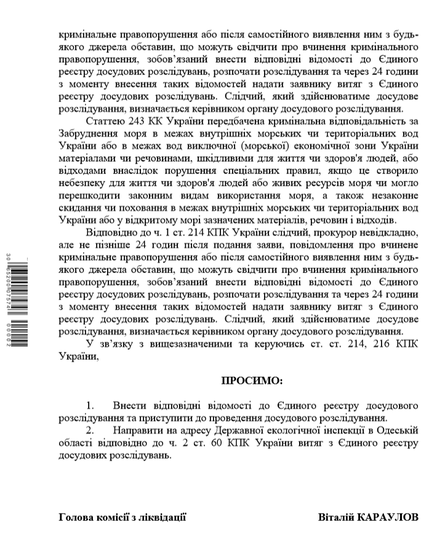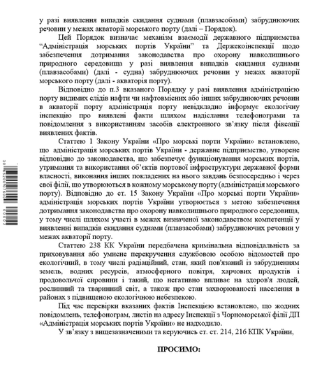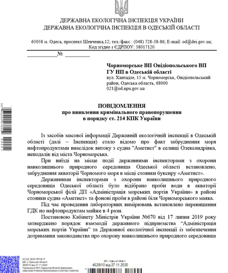 «Оскільки АМПУ не виконала своїх зобов’язань, не повідомила про факт забруднення акваторії та не сприяла у виявленні забруднення акваторії моря, ДЕІ звернулась до Національної поліції, ДБР та Одеської обласної прокуратури з повідомлення про ознаки кримінального правопорушення. Нагадаю, що стаття 238 Кримінального кодексу України передбачає кримінальну відповідальність за приховування або умисне перекручення службовою особою відомостей про екологічний стан довкілля.