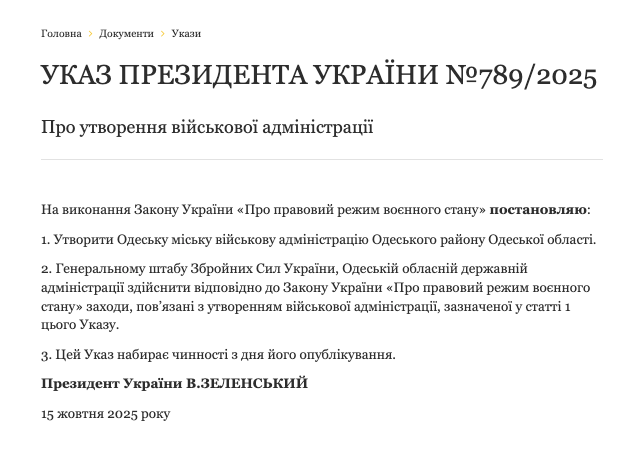 Президент Володимир Зеленський підписав указ про створення Одеської міської військової адміністрації. Про це повідомляє «Главком» з посиланням на указ №789/2025.