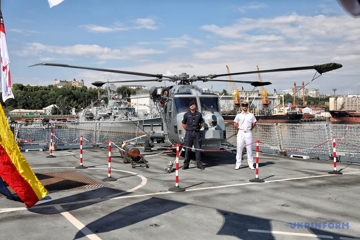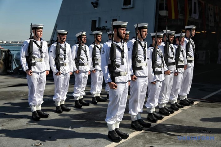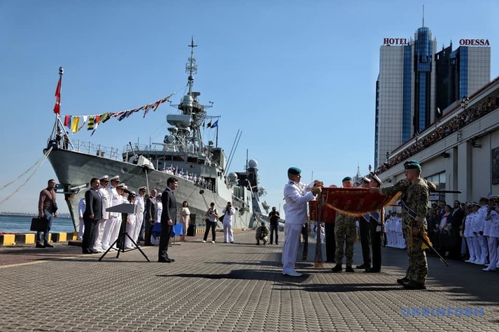 Сьогодні ж на борту флагманського корабля ВМС відбудеться урочиста церемонія передачі команді моряків репліки меча гетьмана України Петра Сагайдачного, яку виготовили українські майстри під керівництвом Дмитра Ейдера - батька одного з військовополонених моряків Андрія Ейдера, захопленого торік РФ у нейтральних водах Чорного моря.
