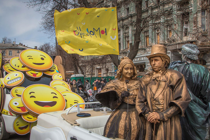 Окремо слід відзначити костюмоване шоу артистів на ходулях, які викликали бурю емоцій у глядачів. Що ж стосується колісної техніки, то в складі ходи були гігантський барабан, машина посмішок, одеська ракета з машиною «Тесла» (наша відповідь Ілону Маску) і звичайно ж, гігантська качка, що стала з недавніх пір символом Гуморини.