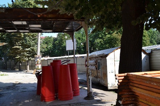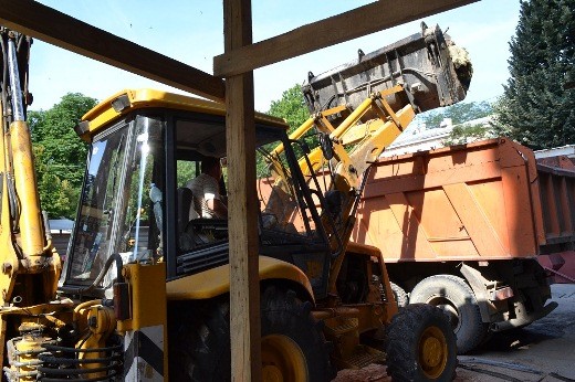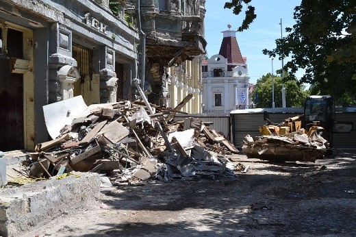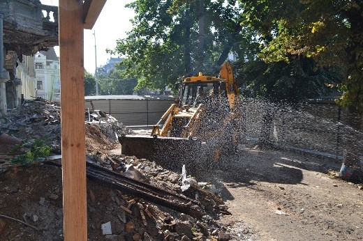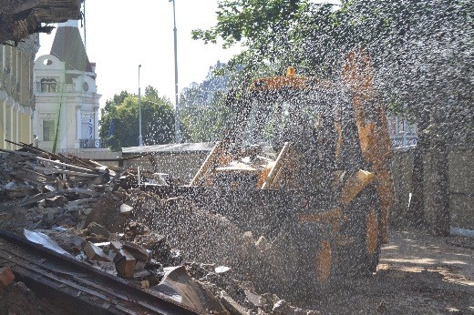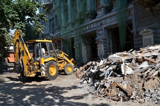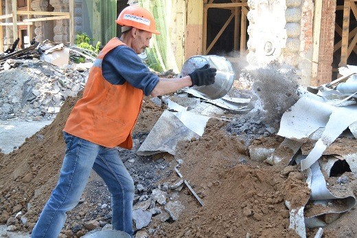 Крім того, з території, прилеглої до будівлі, і з частини підвалів вивезли понад 900 тонн сміття. Це і будівельне сміття (непридатні уламки перекриттів, які постраждали під час серії пожеж, уламки меблів і устаткування з підвалів), і сміття, що скупчилося в будівлі і на території за десятиліття без належної експлуатації. Роботи з розчищення і вивезення сміття ще тривають. Оскільки роботи проводяться в самому центрі міста, при навантаженні сміття в машини пил збивається водою.