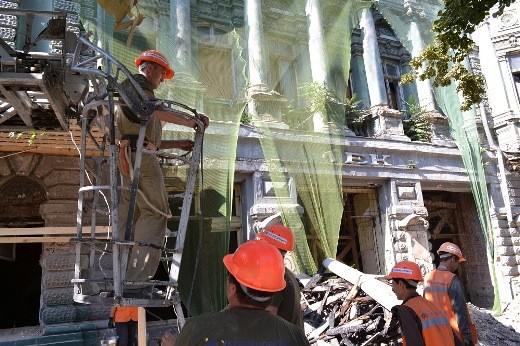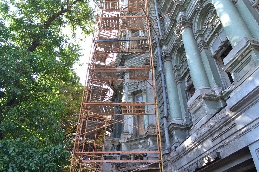 Так, компанією-підрядником проводяться роботи із встановлення будівельних лісів на фасаді Будинку Руссова. Пізніше на лісах буде розміщено будівельну сітку для безпеки в разі падіння елементів ліпного декору, каменів і т. ін. при проведенні ремонтно-реставраційних робіт. Також з метою безпеки встановлено огорожу фасадної частини будівлі.