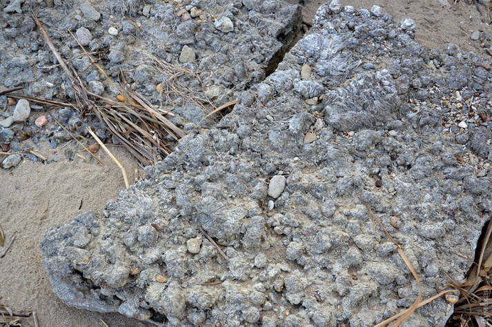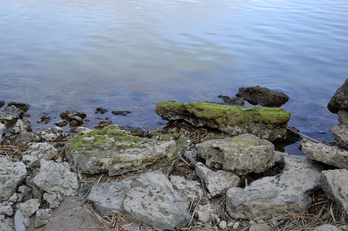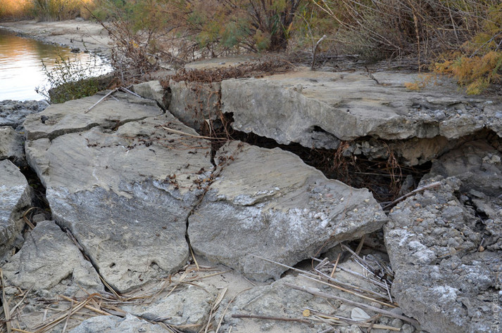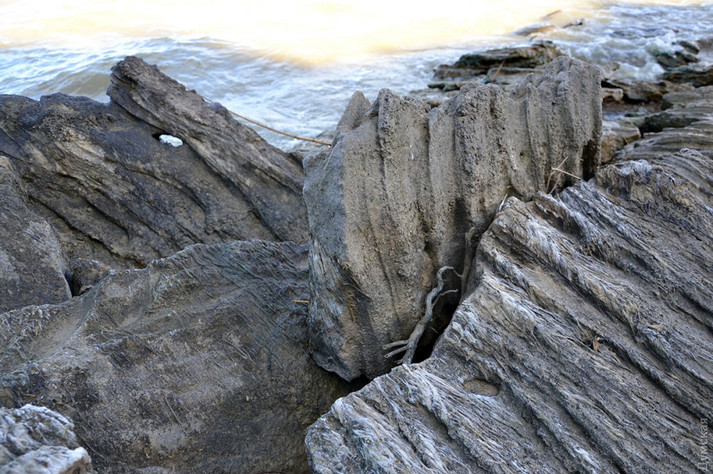 Что касается камней у воды. Это, судя по снимкам, твердые породы, которые, впрочем, камнем не назовешь. В них видны прослойки более грубые и более мелкие, то есть разная степень размера частиц, структура слоистая. Скорее всего, это фрагменты какой-то аллювиальной террасы, они похожи на сцементированные пески, но никакого отношения к лессовым грунтам не имеют — другой возраст и генезис. Но камни эти надо серьезно исследовать.