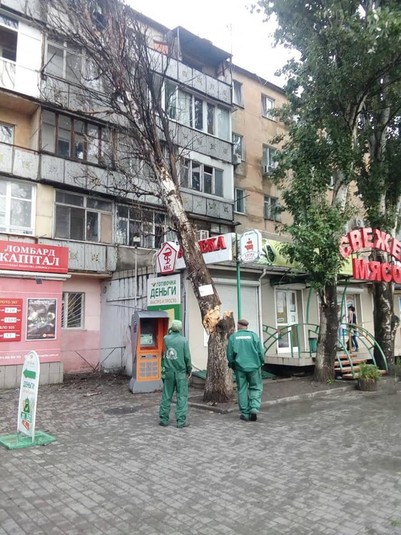 «Вчорашній ураганний порив вітру накоїв бід. Життя не знає умовного способу. Сталося те, чого очікували: гілка в діаметрі 80 см (як велике дерево) не витримала пориву урагану і, голосно хруснувши, звалилася на дах затишного будиночка дуже приємною господині. Ті, хто не дозволили зробити санітарну обрізку дерева, перекривши дорогу машині «Зелентреста», злорадно спостерігали з верхніх поверхів «сталінки», як під дощем працювала бригада МНС ... Тільки диво врятувало господиню будинку, що вийшла за хвилину до того, що сталося, щоб переставити машину. Її відпала али серцевими засобами. Зараз двір залишився без газу. Великі шматки впала частини дерева МНС вивезла. Величезна гора більш дрібних гілок повалена посеред двору.
