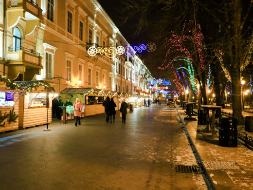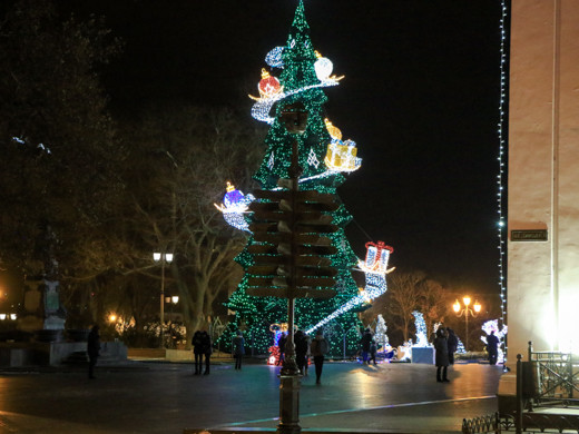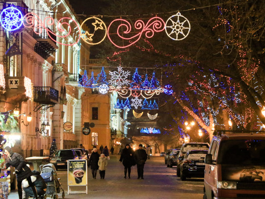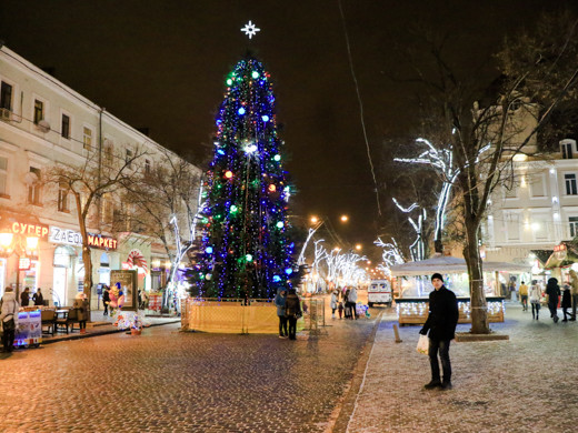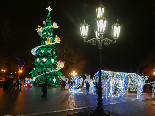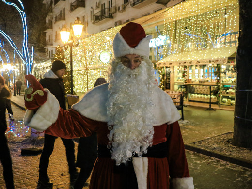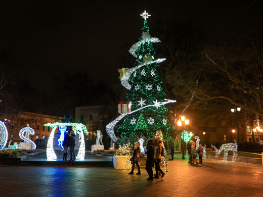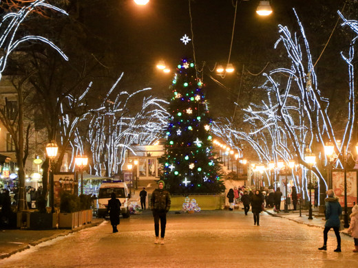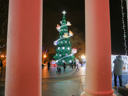 Незважаючи на похмуру погоду, в Одесі панує неповторна атмосфера новорічних і різдвяних свят: світяться ялинки і казкове містечко, прикрашені яскравою ілюмінацією вулиці міста і святково оформлені вітрини, інсталяції та новорічні фотозоні.