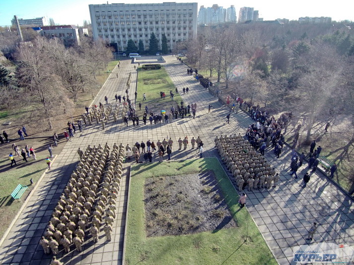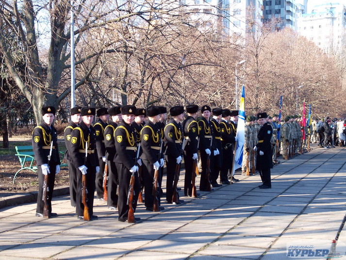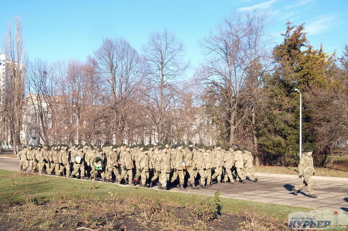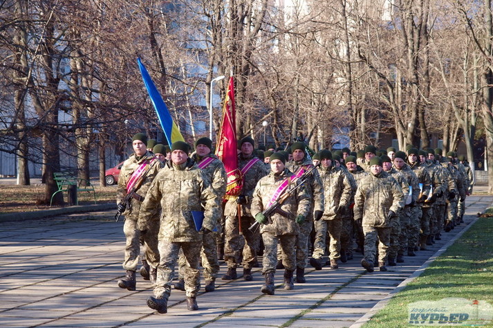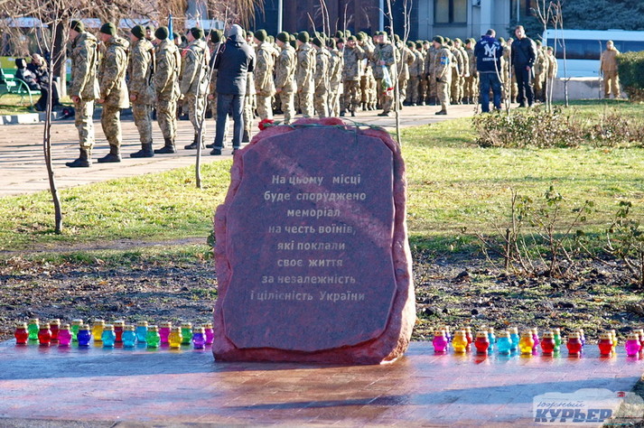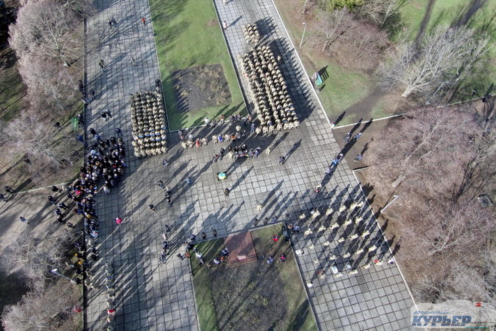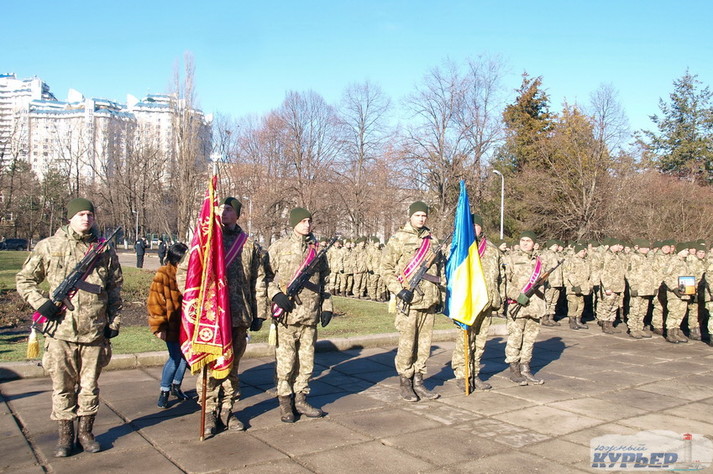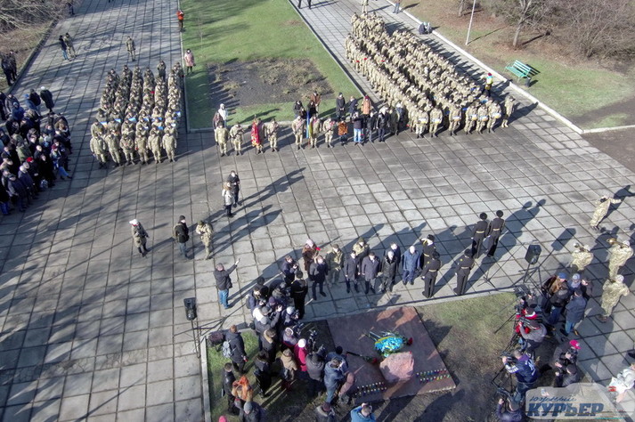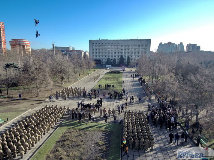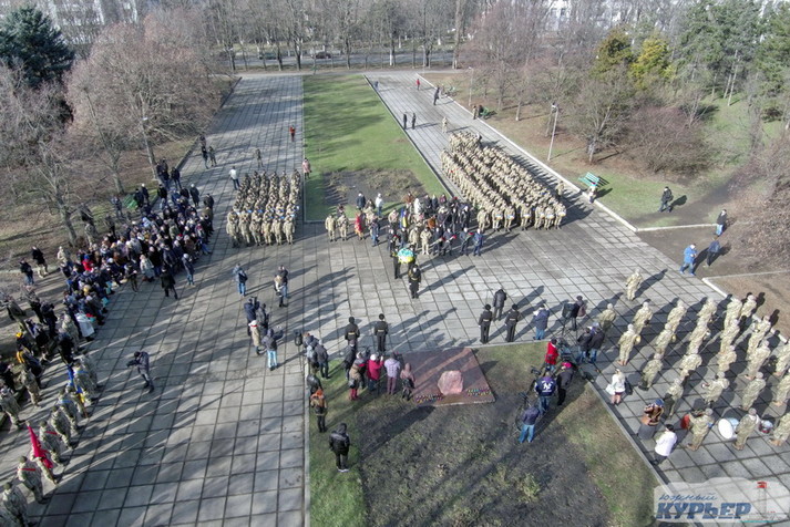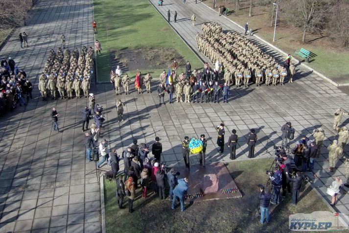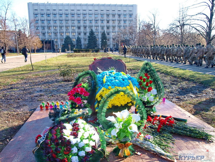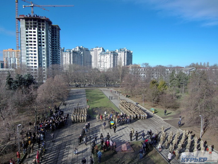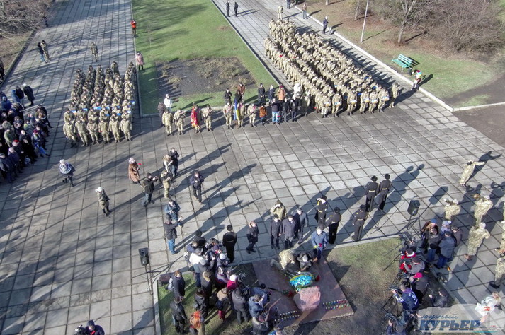 Почалося все в сквері Героїв Небесної Сотні позаду будівлі обласної адміністрації на проспекті Шевченка. Тут, біля пам'ятного знака на місці майбутнього пам'ятника героям АТО, відбувся невеличкий мітинг за участю керівництва оперативного командування «Південь», командування 28-ї окремої механізованої бригади, міських і обласних чиновників.