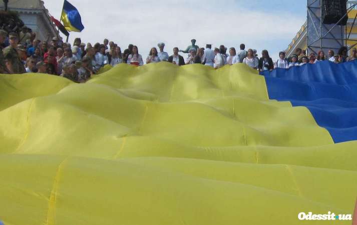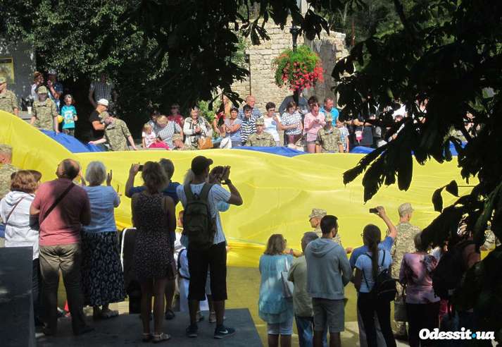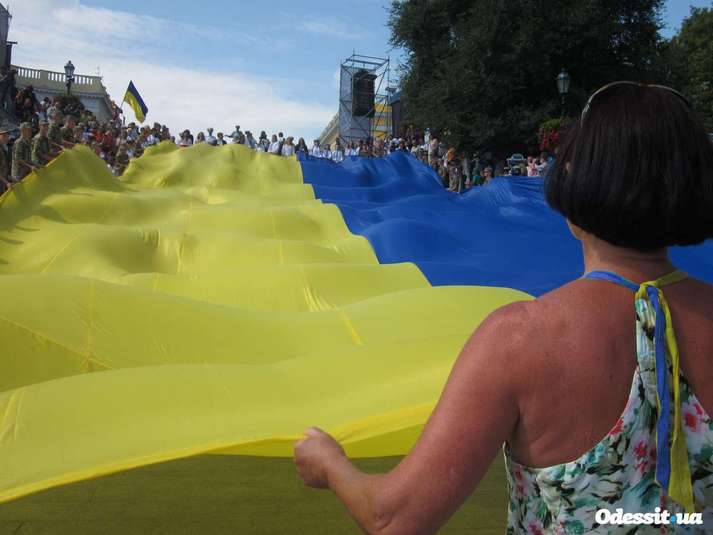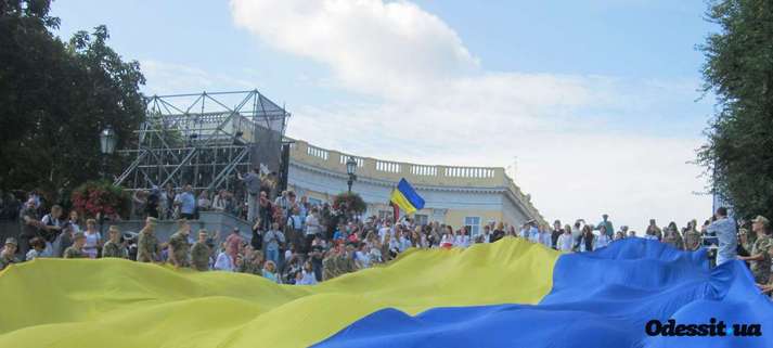 Сьогодні, 23 серпня, на Потьомкінських сходах в Одесі, волонтери розгорнули величезне жовто-блакитне полотнище державного прапору України.