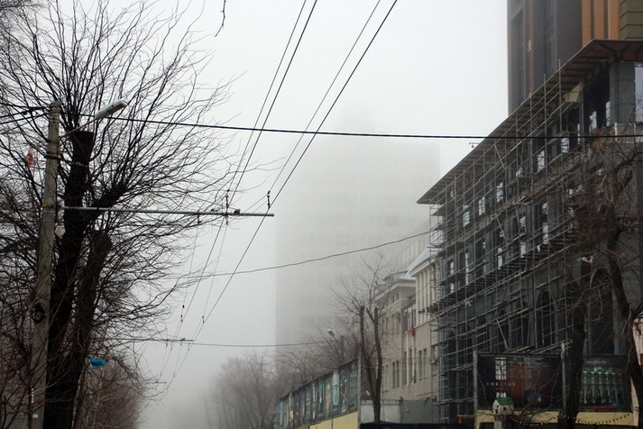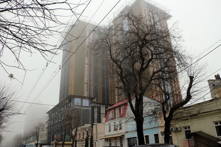 Молочна пелена закривала верхні поверхи висоток, в тому числі хмарочос на Великій Арнаутській.