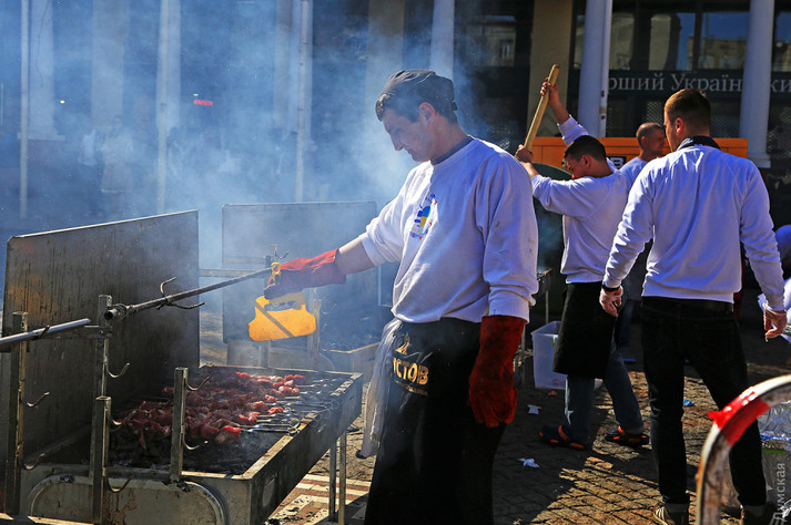 В іншій частині площі греки влаштували величезну кухню з десятком великих мангалів, на яких смажилося м'ясо. У навісу, під яким йшла роздача сувлаки, грецького шашлику, вишикувалася величезна черга - не менше 150-200 осіб. М'ясо роздавали безкоштовно, можна було взяти кілька шматків в одні руки, але, звичайно, в розумних межах.