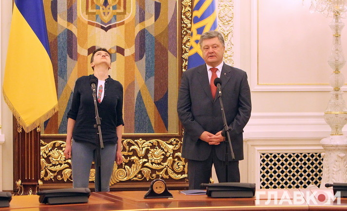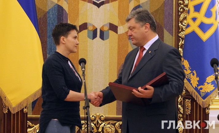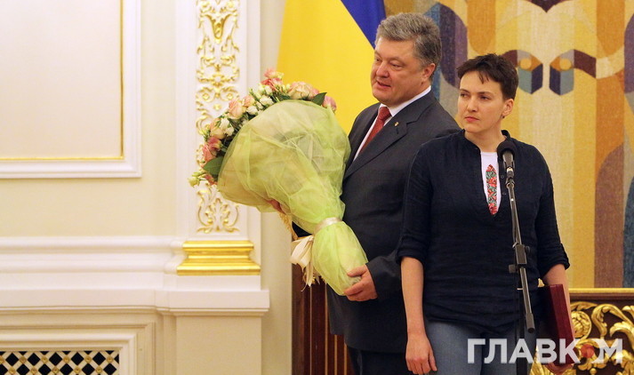 Савченко трималась досить напружено, щоправда, в своїй промові зробила реверанс в сторону президента, похваливши Мінські угоди і пообіцявши зробити все, щоб вони були виконані. Проте відмітила, що мир можливий лише через війну та пообіцяла йти в бій за Україну до переможного кінця. А також наголосила, що за своє звільнення має дякувати українському народу, а не політикам. Після цього Порошенко вручив Надії зірку «Героя України».