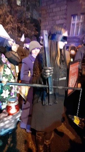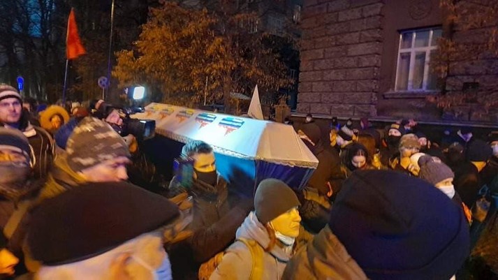 Під час процесії лунала траурна музика. Перед будинком офісу учасників акції зустріла велика кількість поліцейських зі службовими собаками. Правоохоронці дозволили учасникам акції пронести труну ближче до будівлі Офісу президента. Наразі ситуація спокійна, конфліктних ситуацій нема. Кількість учасників заходу становить близько 200 осіб, вони налаштовані йти далі до будинку Міністерства внутрішніх справ та Генпрокуратури.