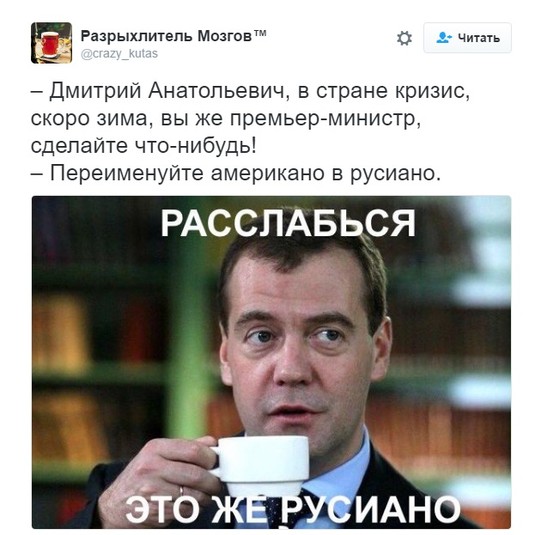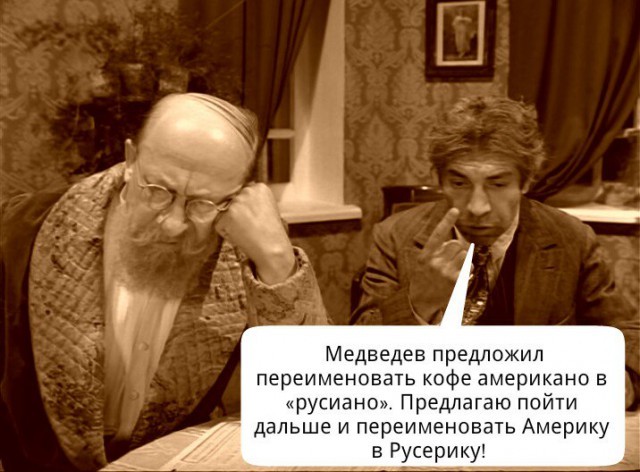 «Каже, дайте мені американо. Це взагалі неполіткоректно звучить. Давайте американо перейменуємо», – заявив російський прем'єр. На запитання, як перейменувати каву американо, російський прем'єр запропонував назву «русіано».