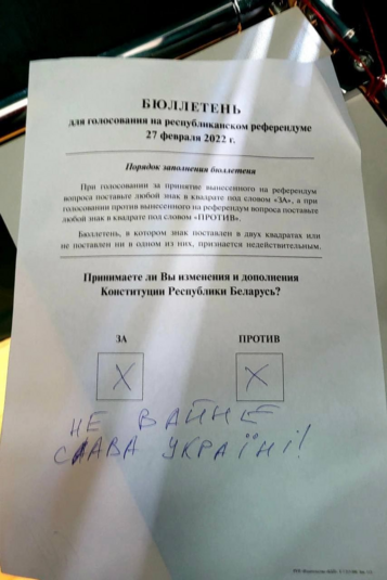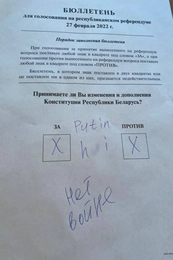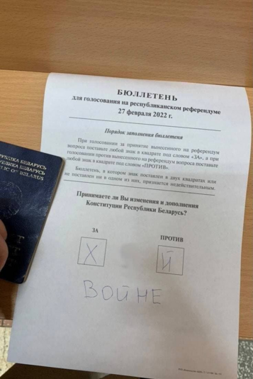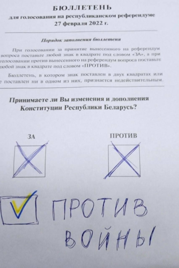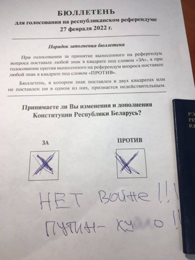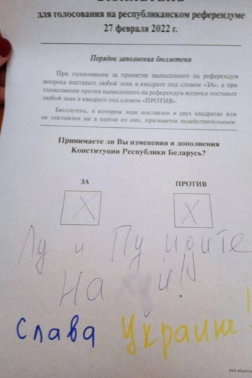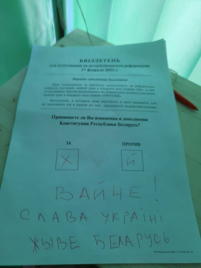 Але навіть в такій ганебній ситуації, частина білорусів проявила відповідальну позицію і зіпсували бюлетені, висловивши свій протест через можливу війну проти України.