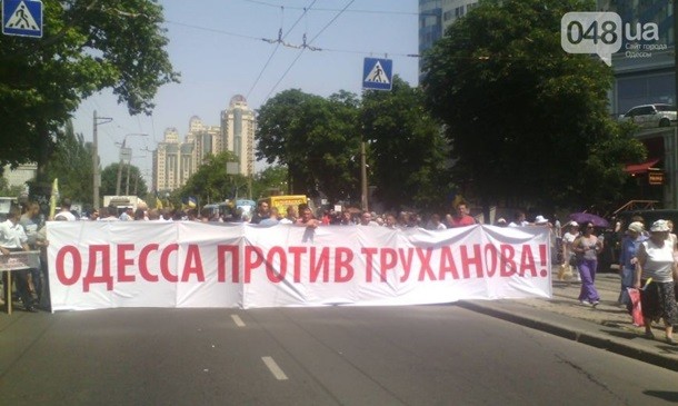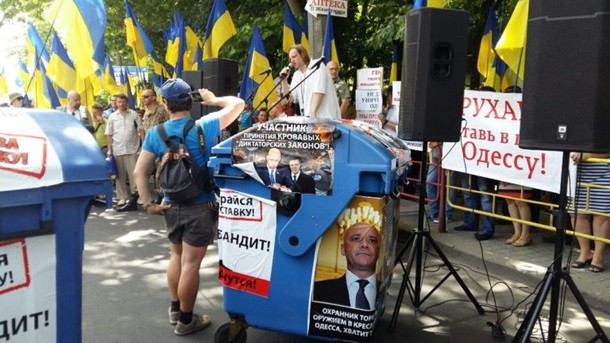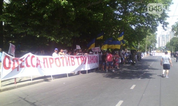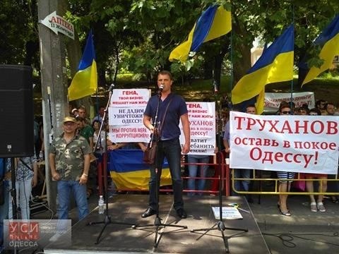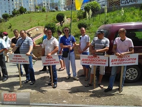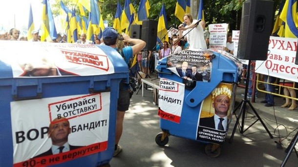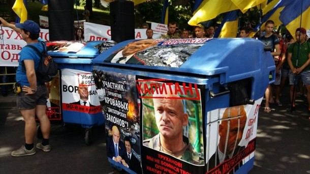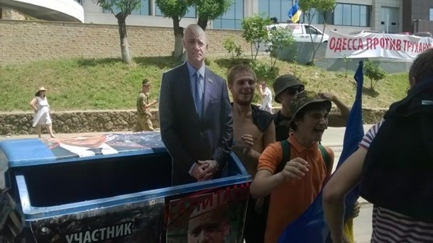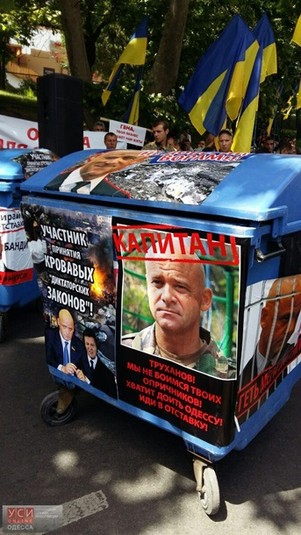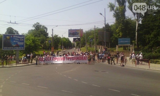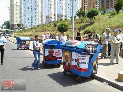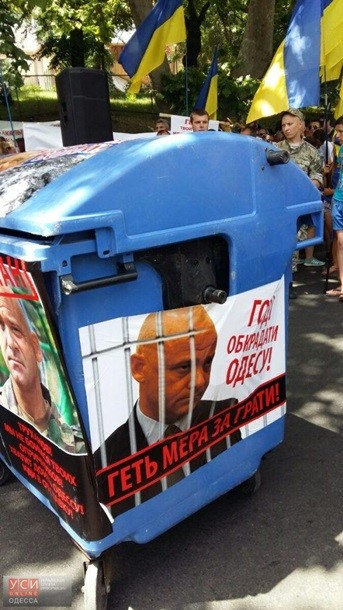Мітингувальники розтягнули транспарант з написом "Одеса проти Труханова". Також до готелю привезли два сміттєвих баки з фото Труханова. В один з баків помістили фігуру із зображенням мера і провезли його кварталом.