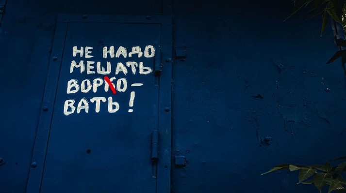 На дверях будівлі митець написав: «Не треба заважати воркувати», закресливши літеру «к»