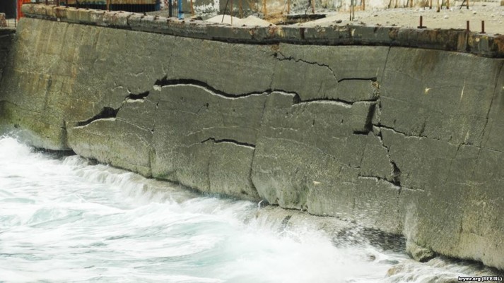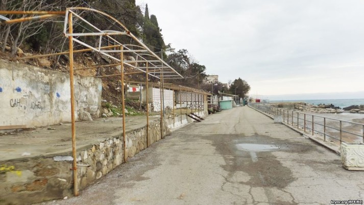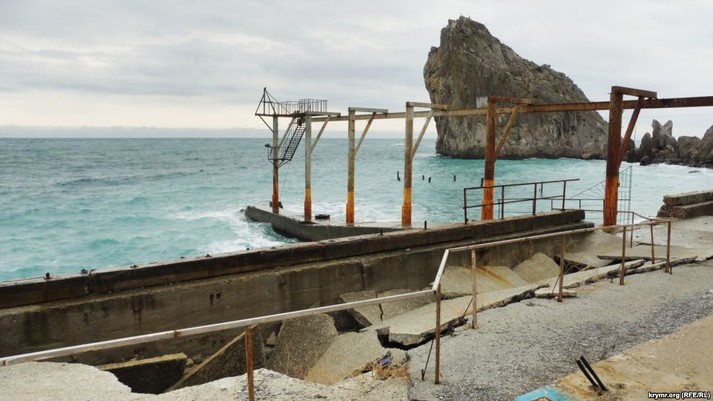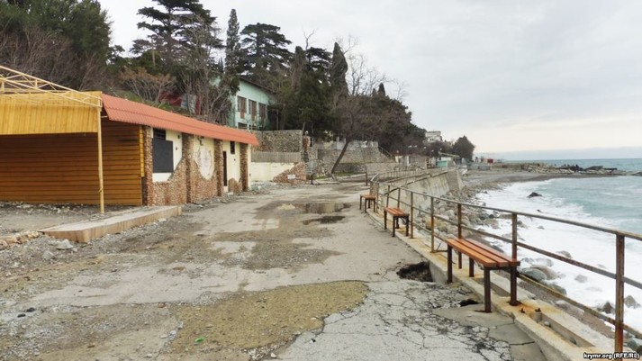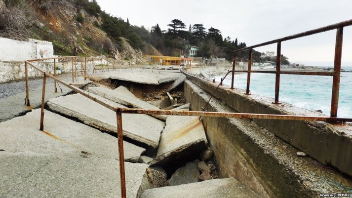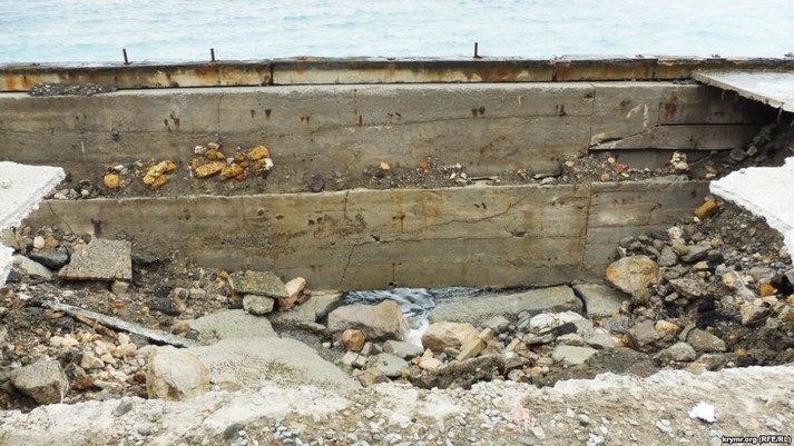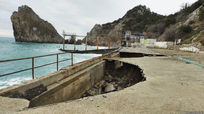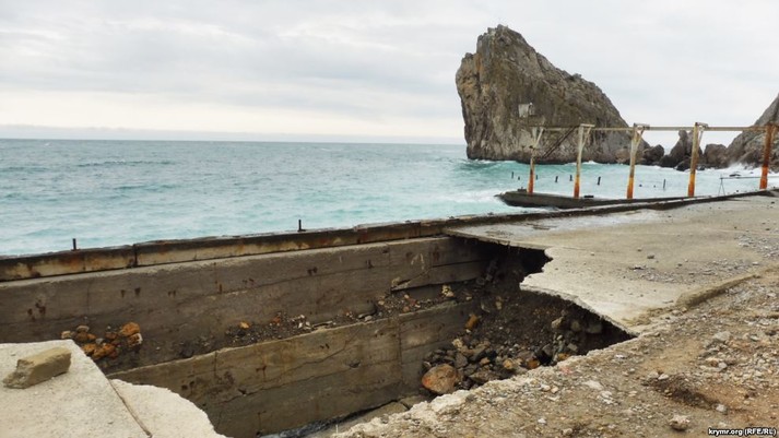 Зламані залізні перекриття колишніх кафе, дірки в асфальті глибиною у три і більше метрів, рови і купи каміння на пляжі – все, що залишилося від набережної у кримському селищі Сімеїз