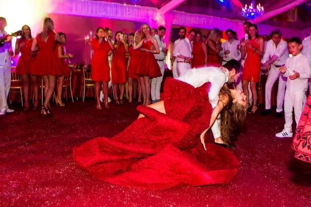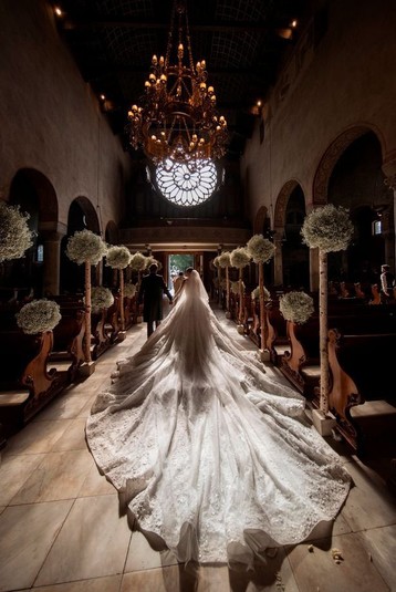 Сукня нареченої з восьмиметровим шлейфом була всіяна 500 тисячами кристалів Swarovski, від чого вбрання важило 46 кг, а вартість його склала $1 млн.