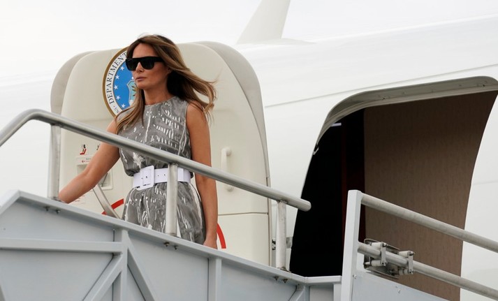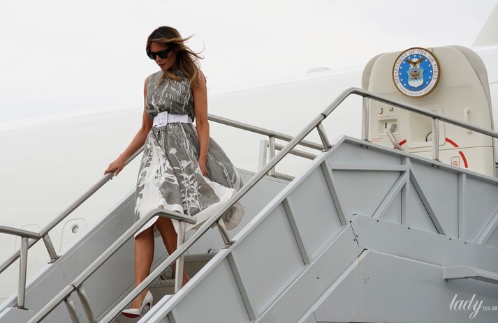 Під час заходу дружина очільника США була одягнена в легку сіру сукню та підбори від Louboutin.