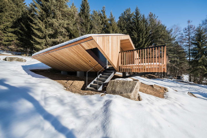 Місце, оточене чудовим ландшафтом, було прикрашене незвичайним будинком, який представляє собою п'ятисторонньому призму, що спирається на шість низьких бетонних стовпів.