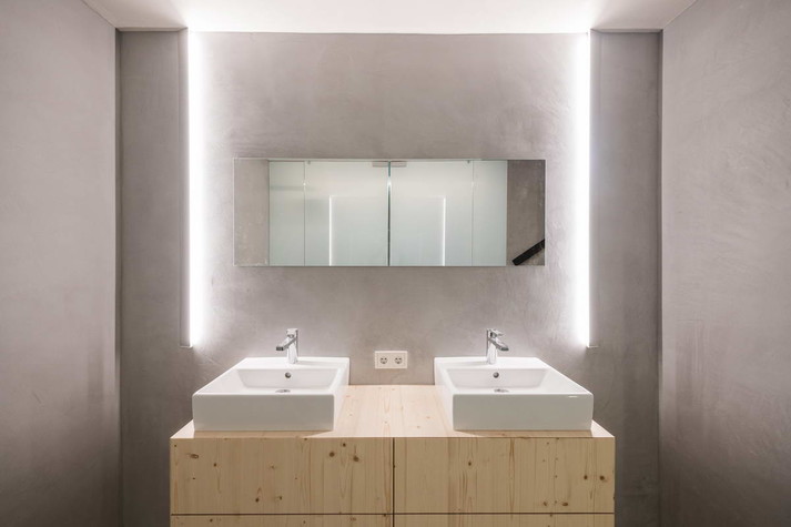 У підвалі денне світло проникає через скляний куб над сходами, а деякі горизонтальні і вертикальні світлодіодні смуги створюють атмосферу, подібну до тієї, яку Лакнер створив в головній кімнаті за допомогою вікна і непрямого освітлення, що створюється бічними ліхтарями.