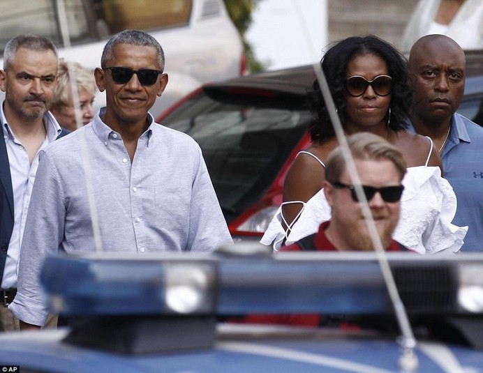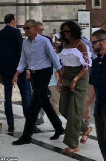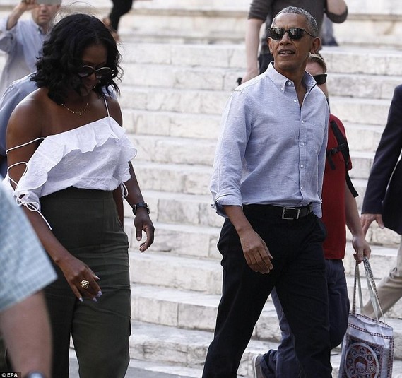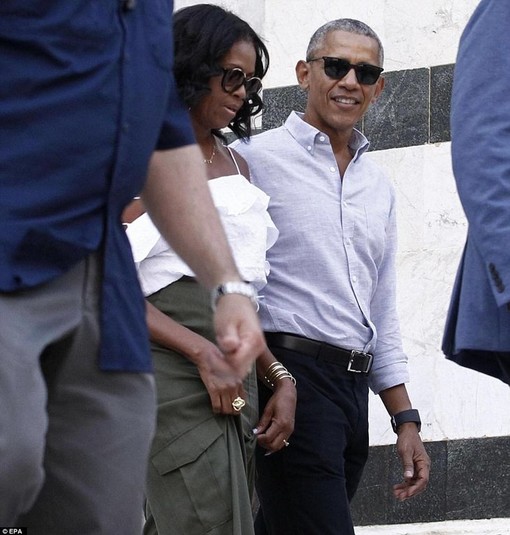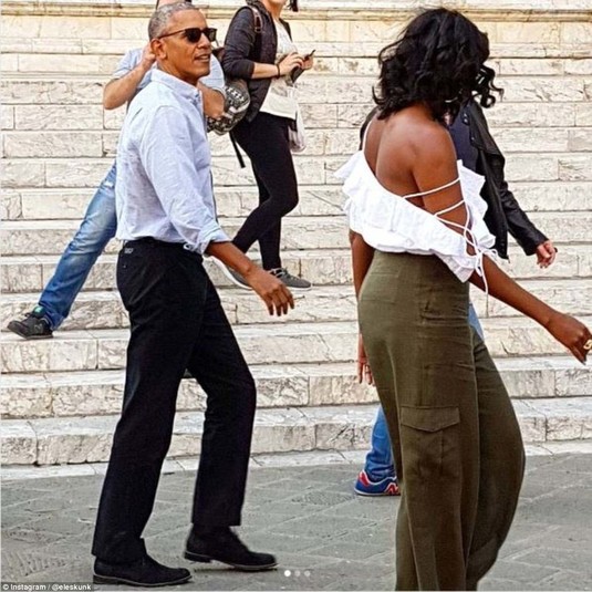На деяких знімках видно, що з одного боку бретельки на топі спали, оголивши праве плече Мішель. Колишній президент вибрав більш стриманий наряд. Барак Обама віддав перевагу класичним брюкам та сорочці блакитного відтінку.