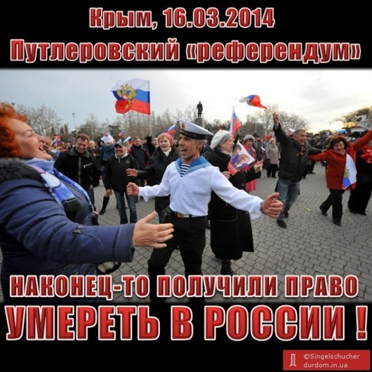 У соціальних мережах у 2014 році користувачі відверто глузували з так званого референдуму та його головного організатора Володимира Путіна. Зокрема, акцент робився на тому, що голосування відбувалося під дулами зброї російських військових.