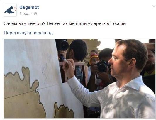 За часи своєї політичної кар'єри Медведєв став героєм безлічі жартів, фотожаб та анекдотів. Зокрема, його слова про відсутність коштів для пенсіонерів («Просто денег нет сейчас. Найдем деньги – сделаем индексацию. Вы держитесь здесь, вам всего доброго, хорошего настроения и здоровья»), сказані в окупованому Криму, відразу стали мемом та приводом для глузувань.
