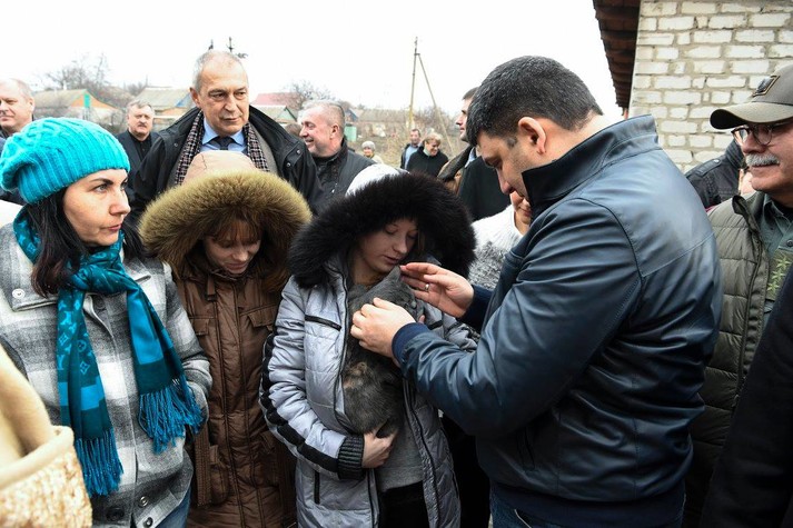 Зокрема, очільник уряду поспілкувався з місцевими мешканцями, а також не оминув своєю увагою і кота, якого тримала одна з жінок, присутніх на зустрічі.