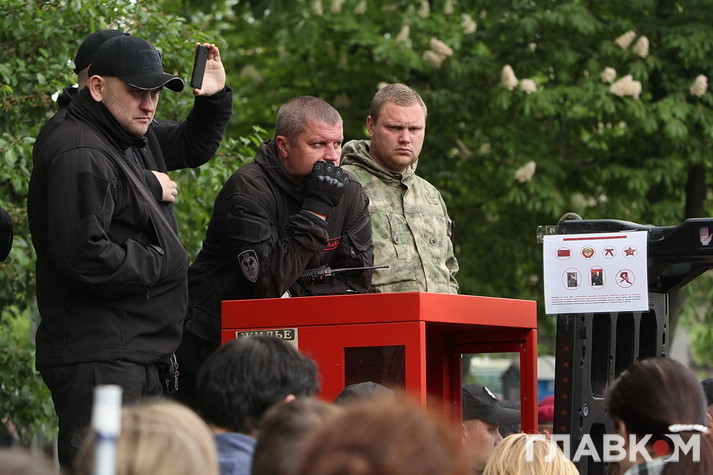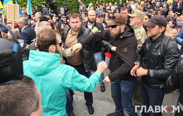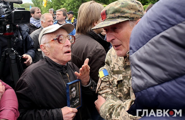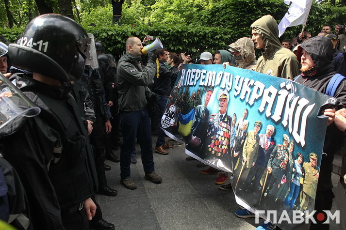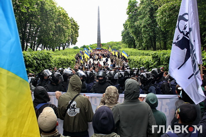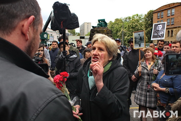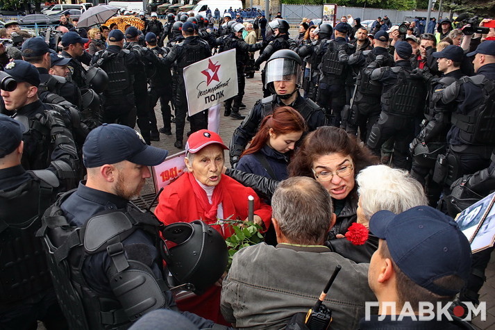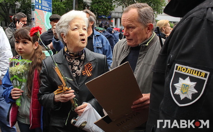 Втім бажаючих поцікавитись у учасників української версії «Безсмертного полку» їхніми політичними поглядами було достатньо. Поліцейські дуже чемно просили тих, хто прийшов з забороненою символікою на кшталт георгієвської стрічки, зняти її, але не завжди такі умовляння приносили результат. Тоді в ситуацію втручалась свідома громадськість – кореспондент «Главкому» став свідком того, як один активіст просто зірвав стрічку з впертої жінки, дорікнувши правоохоронцям, що робить їхню роботу. Перепалки виникали періодично і згодом навіть переростали в сутички, які, щоправда, швидко локалізовувались завдяки величезній кількості правоохоронців – всього в Києві було задіяно біля семи тисяч силовиків.