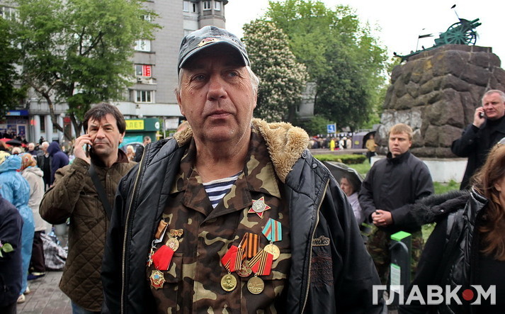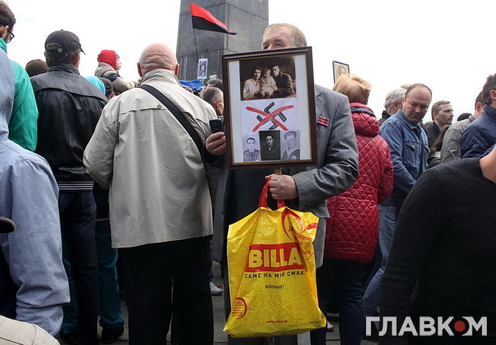 По вулиці, якою мала пройти хода, вишукувались люди з прапорами України, грали оркестри. Всередину пускали через металодетектори, але обшукували людей дуже вибірково – тотального «шмону» не було. Контингент учасників ходи був дуже різношерстим. Вистачало як досить свідомих, так і міських божевільних, від яких всі тримались осторонь, – одна з таких голосила: «Кто на нас нападет – через 15 минут умрет». Хто такі «нас» – ніхто не насмілювався уточнити. Деякі учасники ходи не приховували своїх проросійських поглядів, заявляючи, що Україна і Росія – навіки разом. На них поліція не реагувала, а от персонажів з серпами і молотами відводила вбік для виховної бесіди. Окремо трималось «біле братство» з накидками «Вера и память». На чолі колони опинились екс-народний депутат, «регіоналка» Ірина Бережна, яка є частим гостем на російських каналах, де розповідає про звірства хунти, та екс-прем’єр Валерій Пустовойтенко. Бережна робила селфі з портретом та з задоволенням позувала фотографам. Інші учасники співали пісні з репертуару, що десятиліттями експлуатується у цей день, – «Расцветали яблони и груши», «Вставай, страна огромная»… Все це дивно перекликалось з «Лента за лентою» та «Нахтигалем» з «оунівських» динаміків.