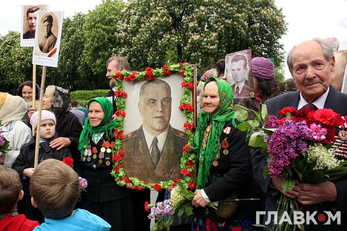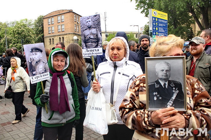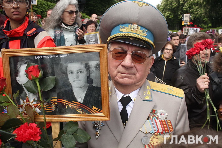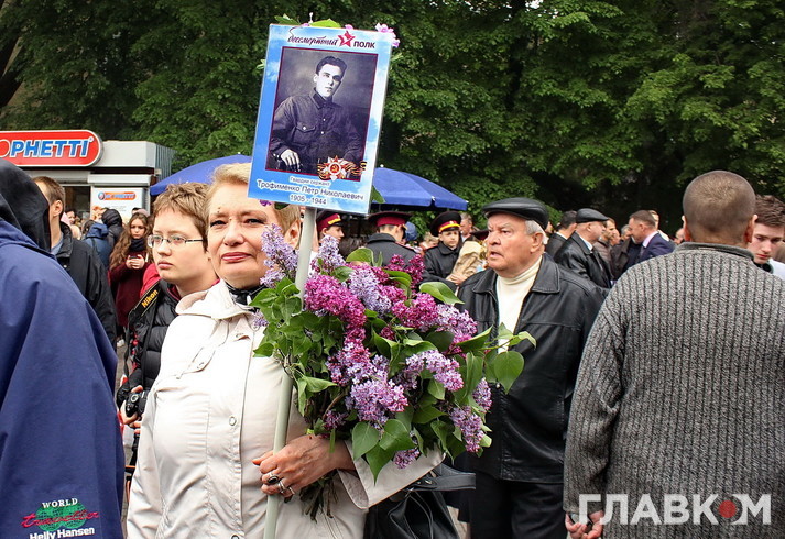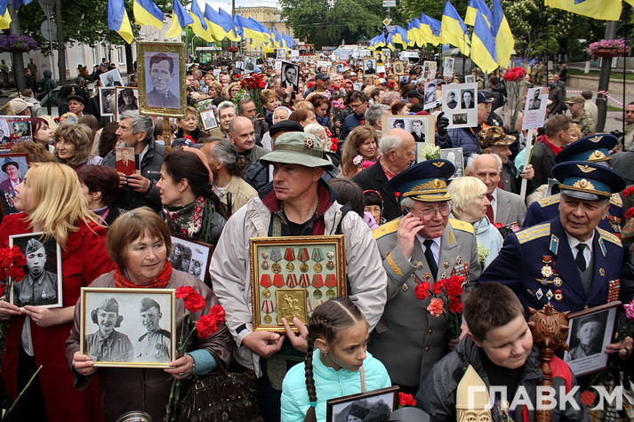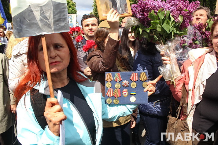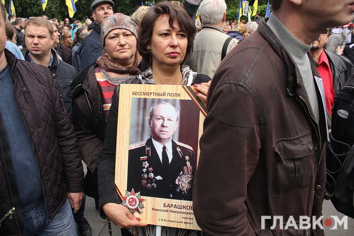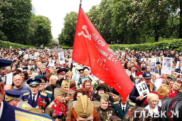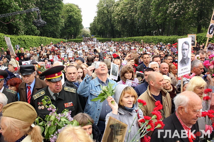День перемоги цього року в Києві відбувся під знаком акції «Ніхто не забутий, ніщо не забуто», яка була зроблена за відомою російською «франшизою» «Безсмертний полк». У Росії це хода з портретами родичів, які начебто брали участь у Другій світовій війні. Вона розпочиналася як громадська ініціатива, але впродовж останніх кількох років набула пропагандистського змісту і підтримується на державному рівні. Аналогічні ходи в цей день з різним успіхом пройшли і в інших областях України. В столиці, за словами організатора Олени Бережної, акція проходила «за ініціативою Київської міської організації ветеранів України, при підтримці Інституту правової політики та соціального захисту і інших громадських організацій».