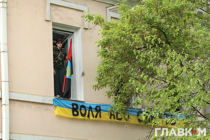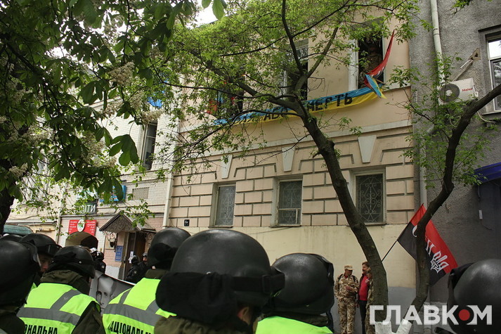 Націоналісти з ОУН заздалегідь пообіцяли зірвати «кремлівський шабаш» в центрі столиці, перетворивши його у «Смертний полк», і закликали всіх небайдужих зібратись біля метро «Арсенальна». Саме там зранку мала формуватись колона учасників ходи. ОУН дійсно відзначилась, але дещо в інший спосіб. Офіс організації на вулиці Мазепи, на якій і мала пройти акція, був зранку оточений поліцією і націоналістів було блоковано, щоб вони не могли вийти до завершення ходи. «Оунівці» в свою чергу кидали з вікон фаєри, вигукували гасла «Революція», «Воля або смерть», «Комуняку на гілляку» та крутили у виставленому динаміку патріотичні пісні. Особливо запам’ятався важкий метал з приспівом «Нахтігаль».
