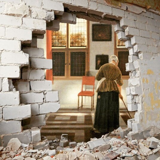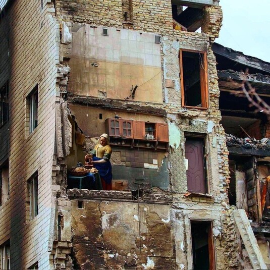У її роботах – фотографії реальних українських військових, поранених під час обстрілів українців та їхніх зруйнованих домівок та світові шедеври – картини Яна Вермера, Едварда Мане, Едварда Гоппера, Вільяма Маргетсона та інших.