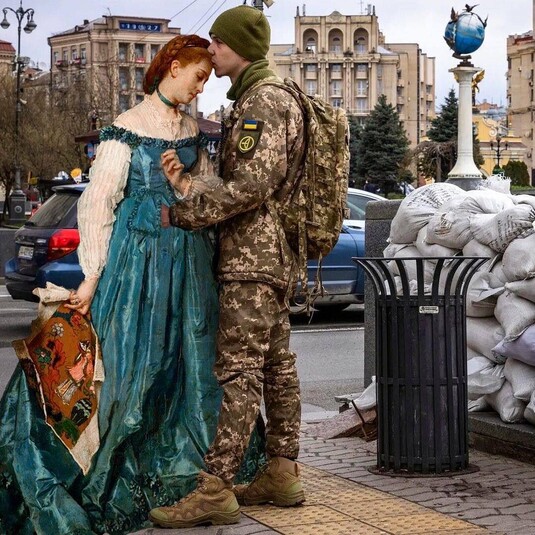 Так, у серії картин Фанні Лешевальє можна побачити скривавлену Українку з Харкова, яка попри все посміхається (її фото було чи не першим 24 лютого, яке облетіло увесь світ), пару, яка прощається на Майдані Незалежності і пару, яка вперше після довгої розлуки зустрілася в кінці квітня…