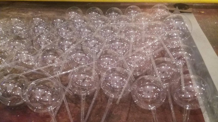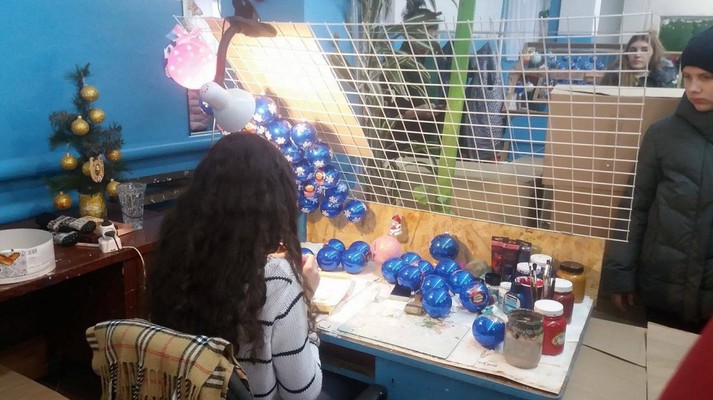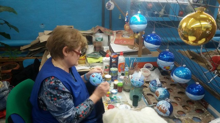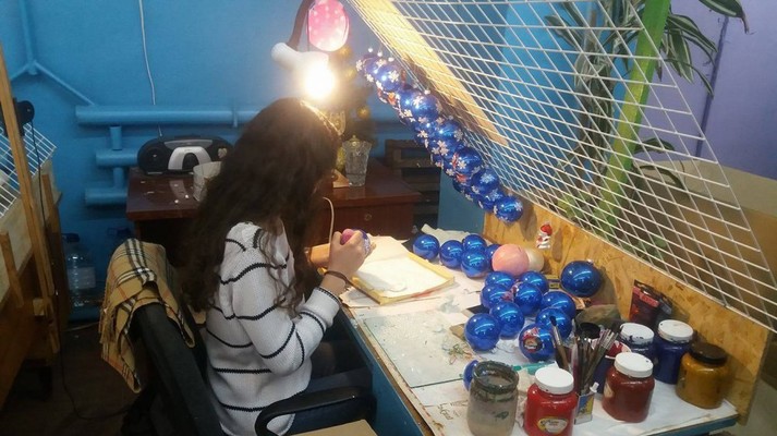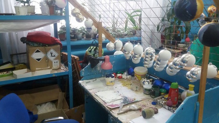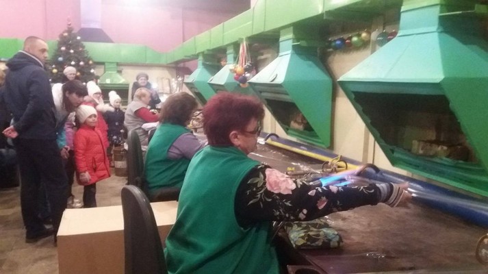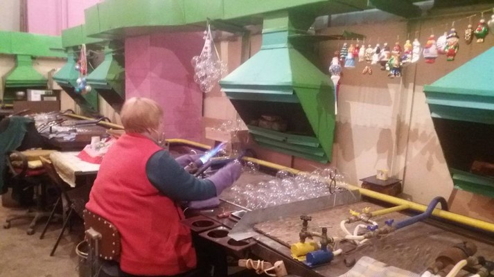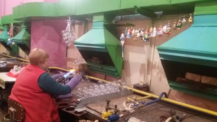 Довгий коридор завішаний теж плакатами та гірляндами. У приміщенні прохолодно, але тут з приходом нового керівництва стало комфортно працювати. Торік зробили опалення у цехах. До того приміщення не опалювалися. В цеху склодувів роблять заготовки для кульок. Жінки розігрівають спеціальні заготовки над вогнем і видувають кульку, як мильну бульбашку.