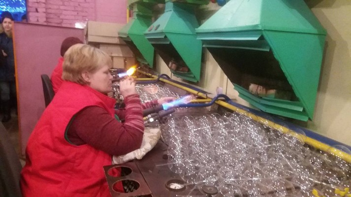 «На склодувів в Україні не вчать. Усе на виробництві. Люди приходять без освіти і вчаться тут. Доки навчаться, можуть попсувати матеріалу більш як на 10 тисяч гривень. Але робота швидко окуплюється, після того як навчаються. Виробництво вважається шкідливим. Тому ті, хто приходить на фабрику залишаються тут до пенсії. Мають пільги за шкідливе виробництво, тому отримують молоко», - додає Ірина.