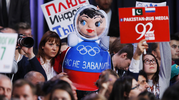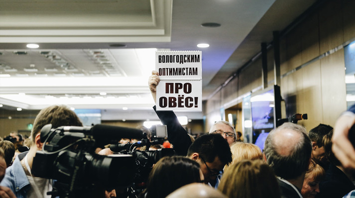 Всього в цьому році було аккредитовано більше 1,6 тис. журналістів, багато з них принесли саморобні плакати плакати: деякі з назвами видань, деякі - з важливими або не дуже темами.