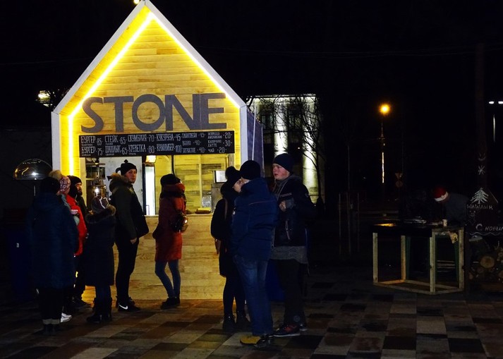 У п'ятнадцяти різдвяних будиночках біля фонтану готують смачний шашлик зі свинини або курки за 55 грн. за 100 грамів, ковбаски за 45 грн. Є можливість посмакувати лавашем із сиром, картоплею або пельменями фрі всього за 35 грн. порція.