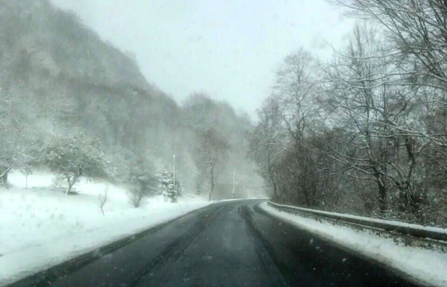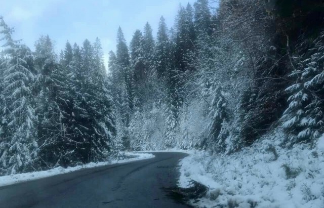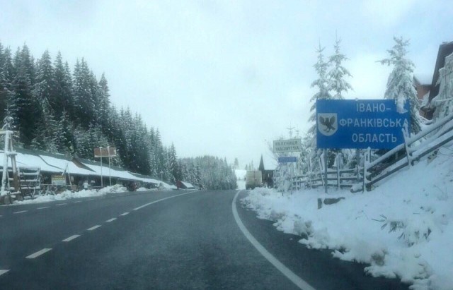 На Рахівщині хоч погода і сонячна, але гори вкриті чималим шаром снігу. Дорога у відносно нормальному стані, їхати слід обережно через налипання мокрого снігу та снігові колії.