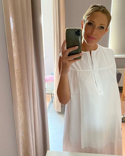 Також на своїй сторінці в Instagram телеведуча опублікувала кілька знімків, на яких показала, як виглядає на наступний день після пологів. Для виходу в прямий ефір Катя одягла білу сорочку з принтом, волосся зібрала в хвіст, а також зробила ніжний макіяж з рожевою помадою.
