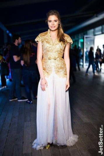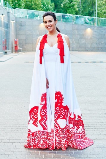 На килимовій доріжці національний коментатор Євробачення Тетяна Терехова сяяла в спокусливій сукні від українського бренду LUVI, а для привітання учасників в Євроклубі вибрала елегантну сукню золотого кольору від дизайнера Тараса Краскіна.