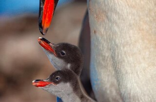 За словами науковців, нині пташенята ще лишаються в гнізді. Годують їх по черзі батьки наловленим в океані крилем. Щоб попоїсти, пінгвінята залазять дзьобиком тату чи мамі в рот, а той «постачає» зі стравоходу порції «смаколиків». Збоку це іноді може виглядати так, ніби дорослий пінгвін намагається проковтнути малого.