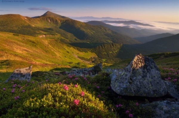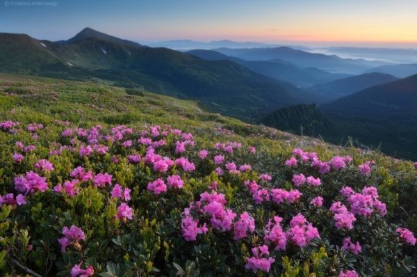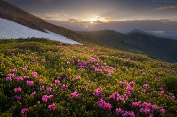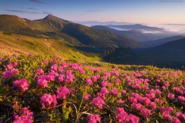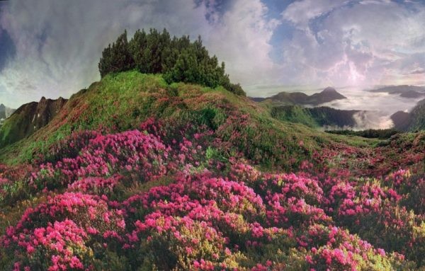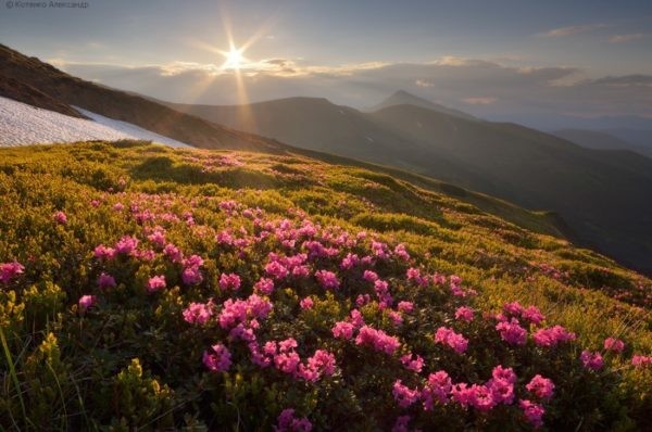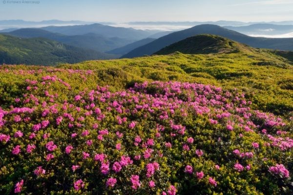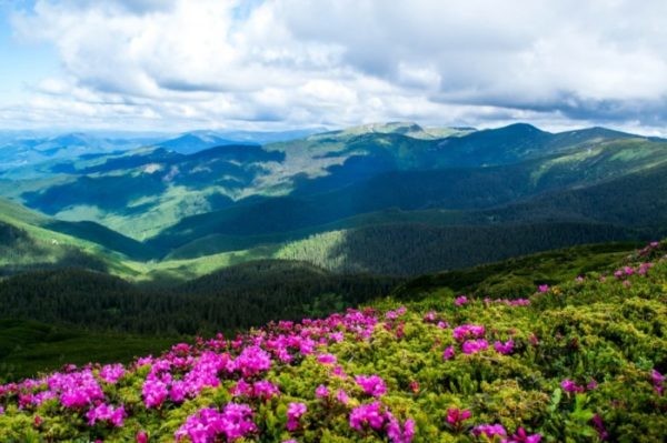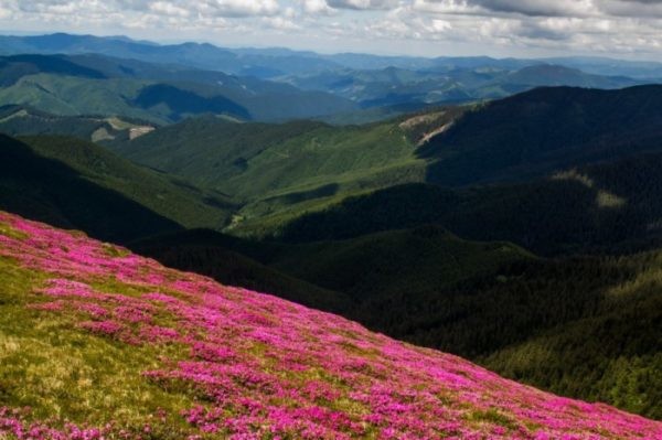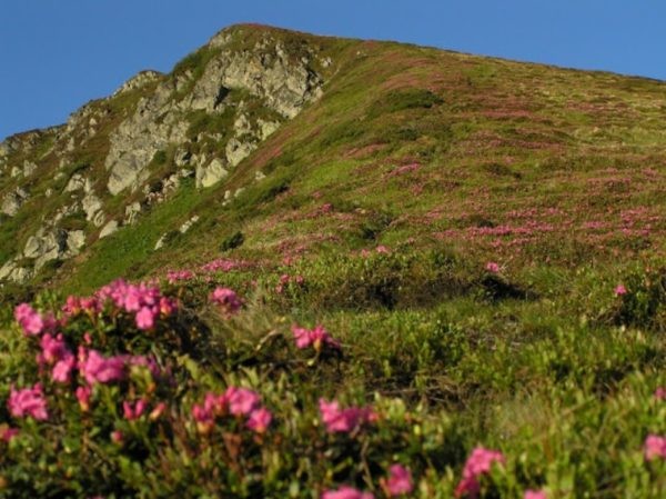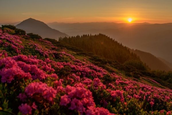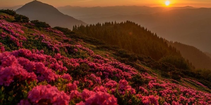 Зникаючи із світанковими променями молодого сонця, він залишає між трав крихітні ніжно-рожеві зірочки. То починають розпускатись квіти рододендрону. З кожним червневим ранком їх стає все більше. Аж поки найвищі карпатські узгір’я не вкриються дивовижним квітучим килимом. Поки не приберуться у найкрасивіші наряди щорічного свята природи – цвітіння Червоної рути.